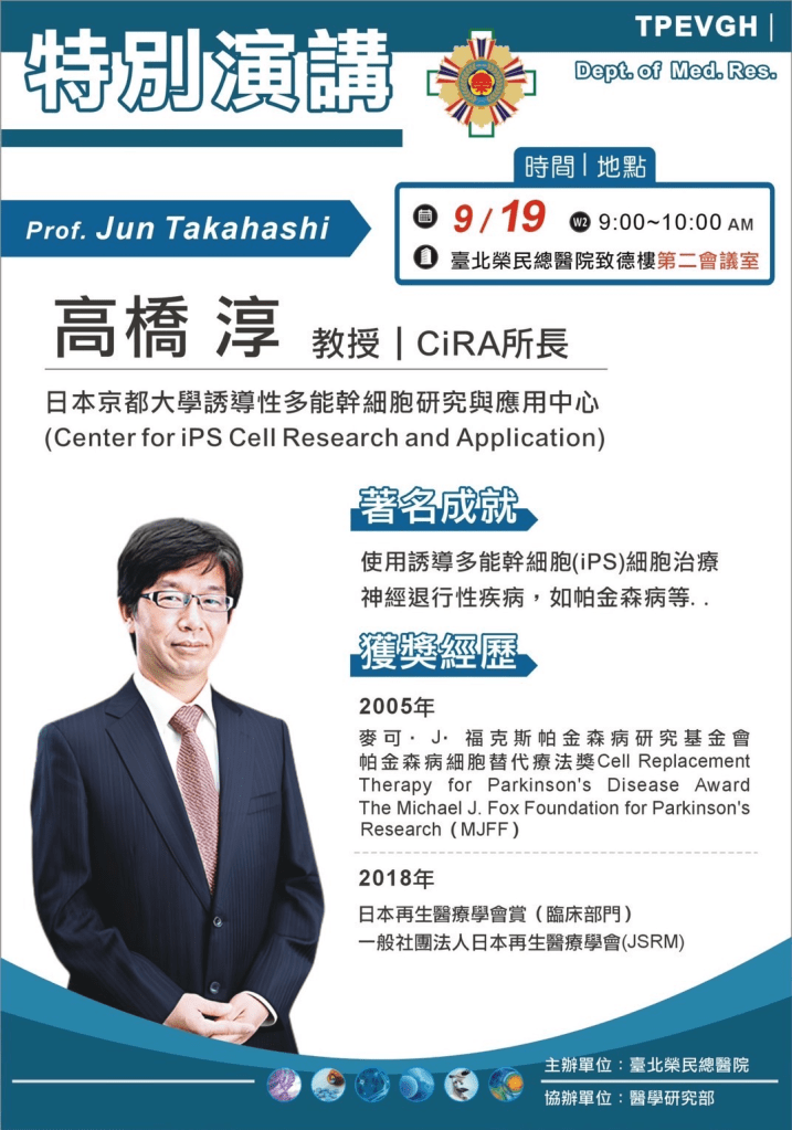 台北榮民總醫院請到京都大學誘導性多能幹細胞研究與應用中心(Center for iPS Cell Research and Application,簡稱CiRA)的現任所長,高橋淳教授,進行一場題為「Unleashing the Potential of iPS Cell Therapy – A Journey with Jun Takahashi」的講演。這是一個難得的機會,我們誠摯邀請各位參加。 高橋淳教授不僅是CiRA的領導者,更是一位傑出的科學家,他的工作在誘導多能幹細胞(iPS)領域具有開創性的重要性。他承襲了諾貝爾獎得主山中伸彌教授的使命,將CiRA發展成為一個在醫學和科學界享譽盛名的機構。高橋淳教授最為人熟知的成就之一,是在神經退行性疾病的研究中,尤其是帕金森病的治療,他成功地應用iPS細胞,為這一領域帶來了嶄新的希望。高橋淳教授在將實驗室的發現轉化為切實的臨床解決方案方面,不斷擴展著我們對神經幹細胞及其潛在治療應用的理解。